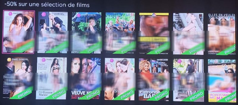 Outre les chaînes linéaires, Dorcel propose 3 services de VOD sur la Freebox : Dorcel Club qui est une formule en illimité, ensuite Dorcel Interactive, qui vous permet de choisir le scenario des films et enfin Dorcel Vision. C’est sur ce dernier, qui est un service de VOD à l’acte, que l’éditeur de films pornographiques annonce des “promotions exceptionnelles sur les meilleurs classiques Dorcel”.